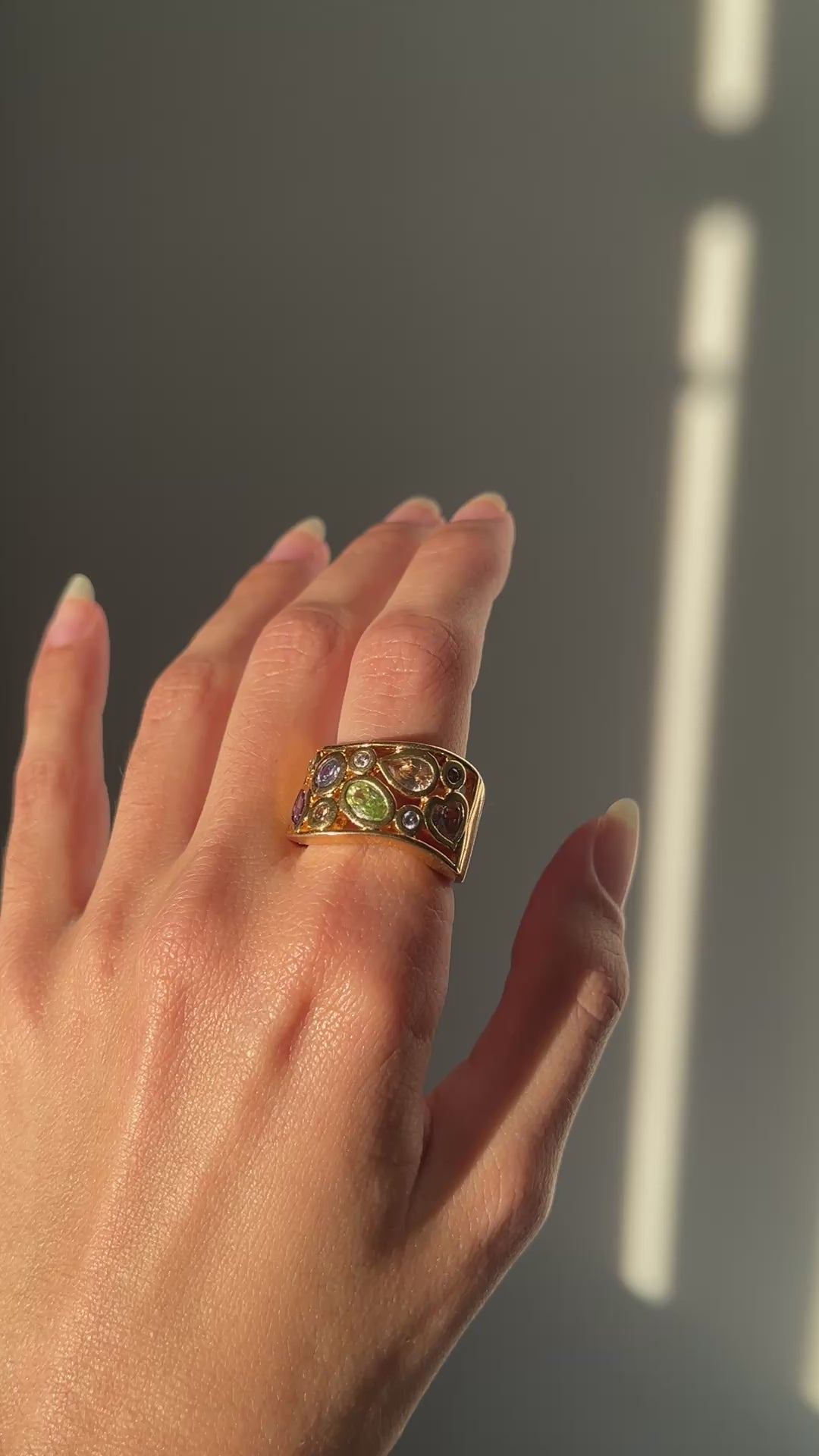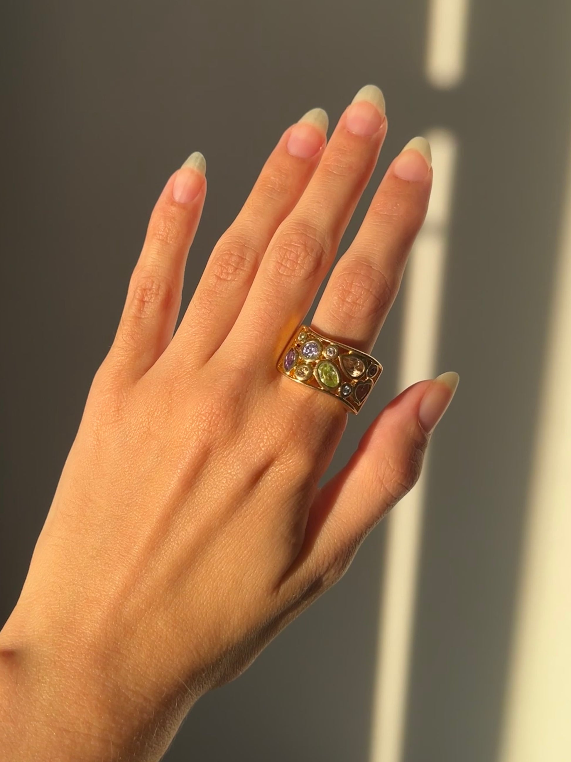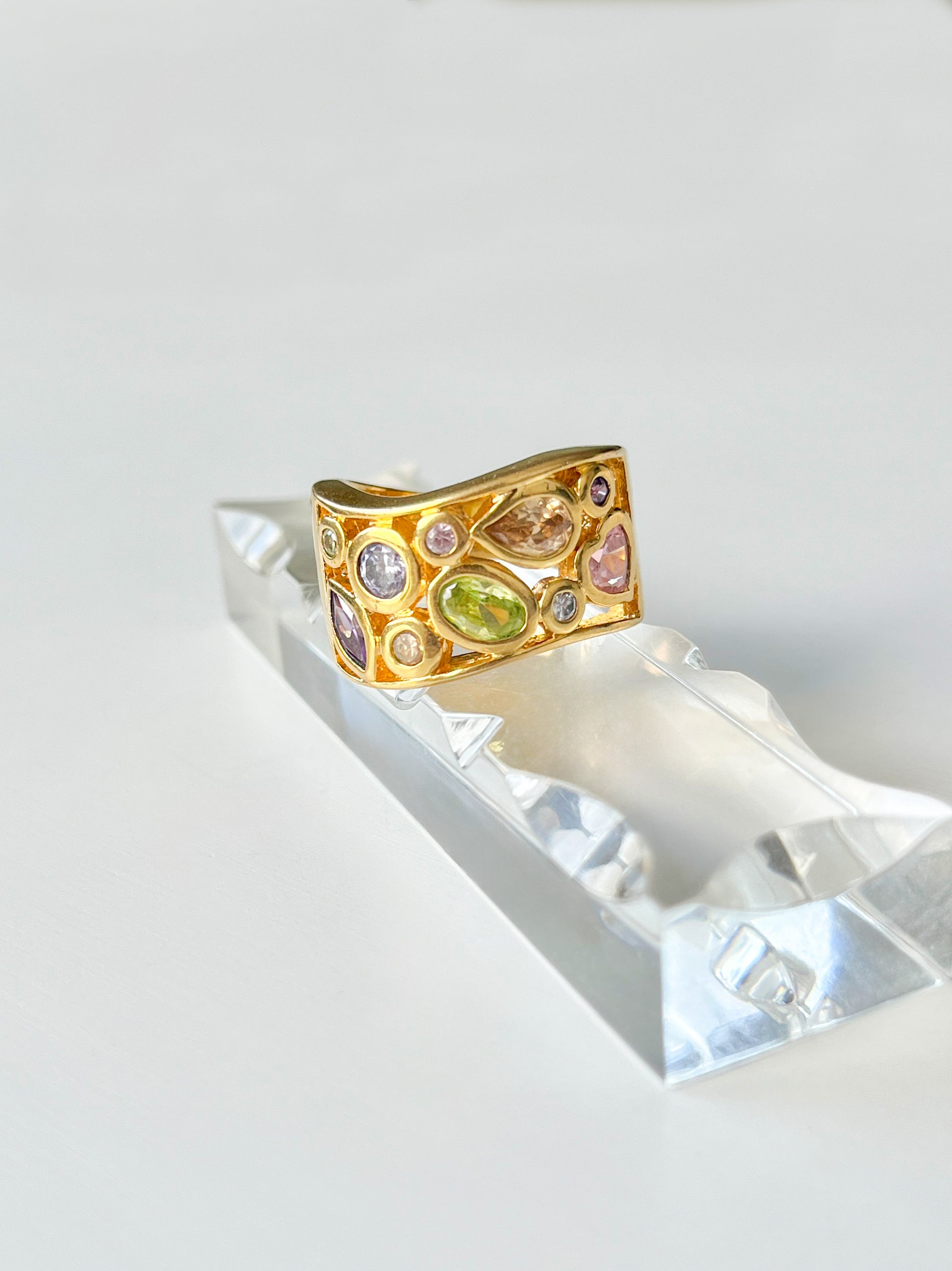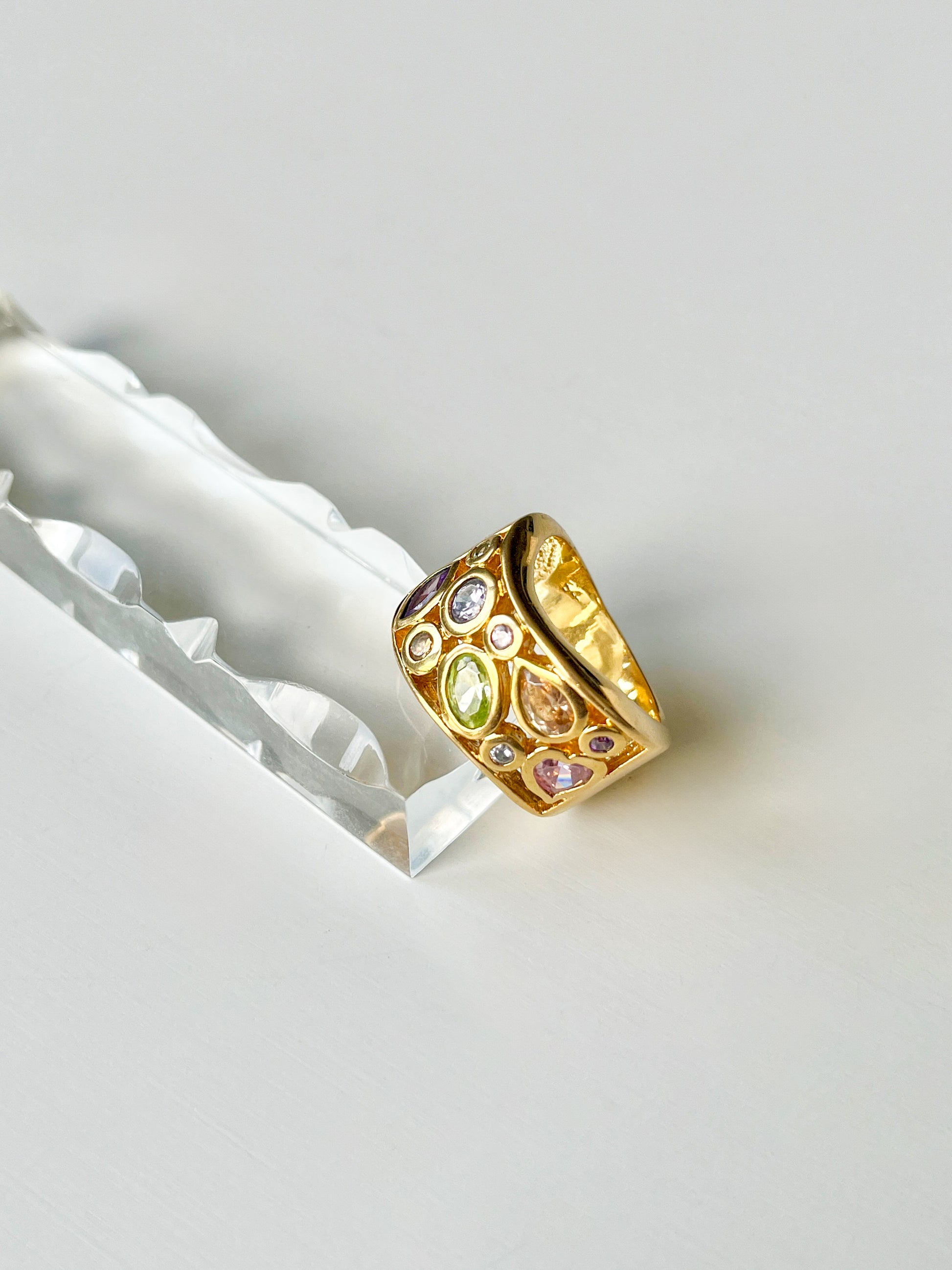 Très belle bague bandeau plaquée or avec de multiples strass colorés. Ses douces teintes rappellent l'été et apportent une touche de fraicheur à n'importe quel look.