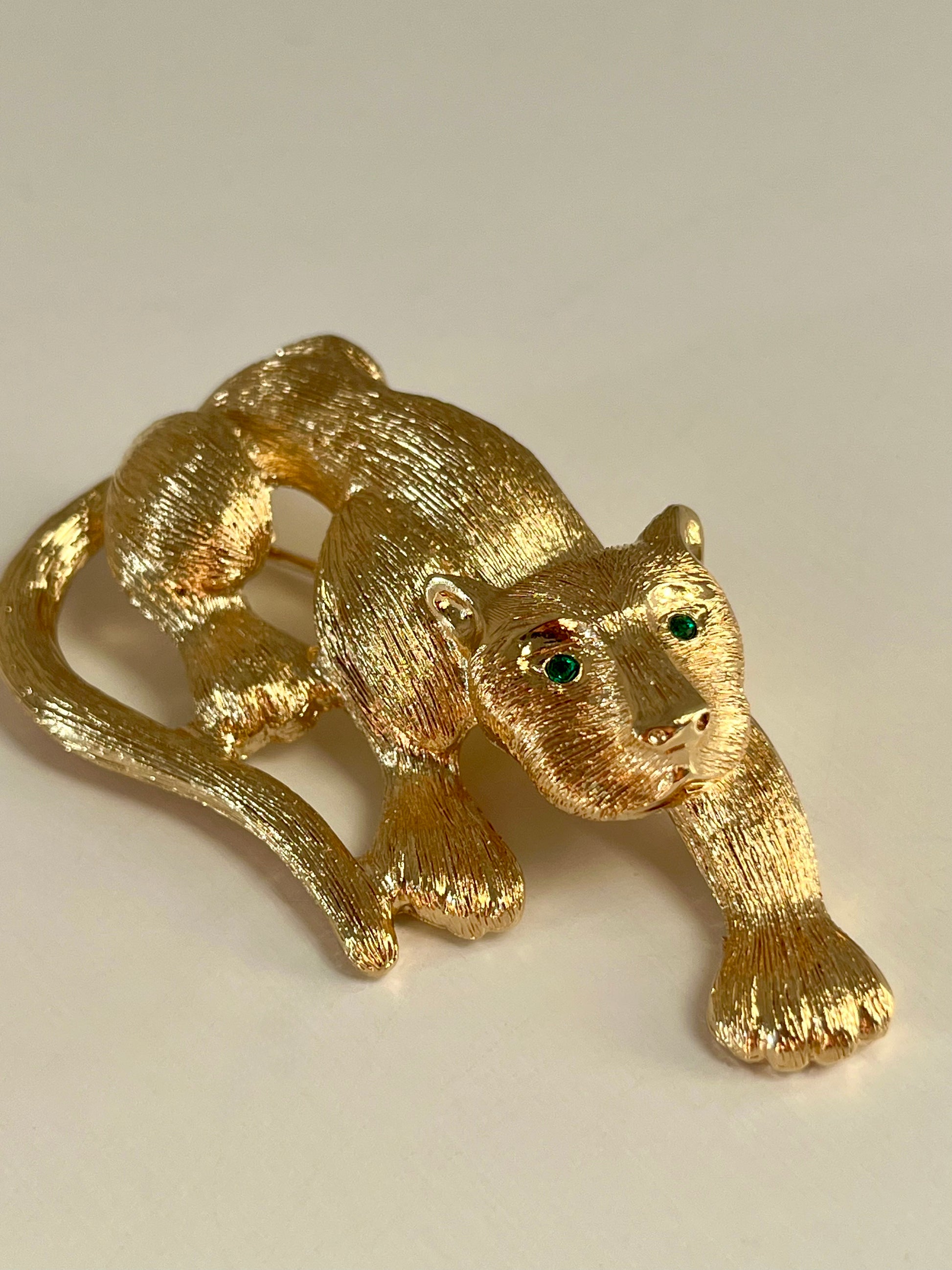 Magnifique broche en forme de panthère signée Pierre Lang des années 80/90. Ses yeux verts et sa texture "striée" pour représenter le pelage la rendent brillante et la subliment, mettant en avant sa confection de haute qualité.