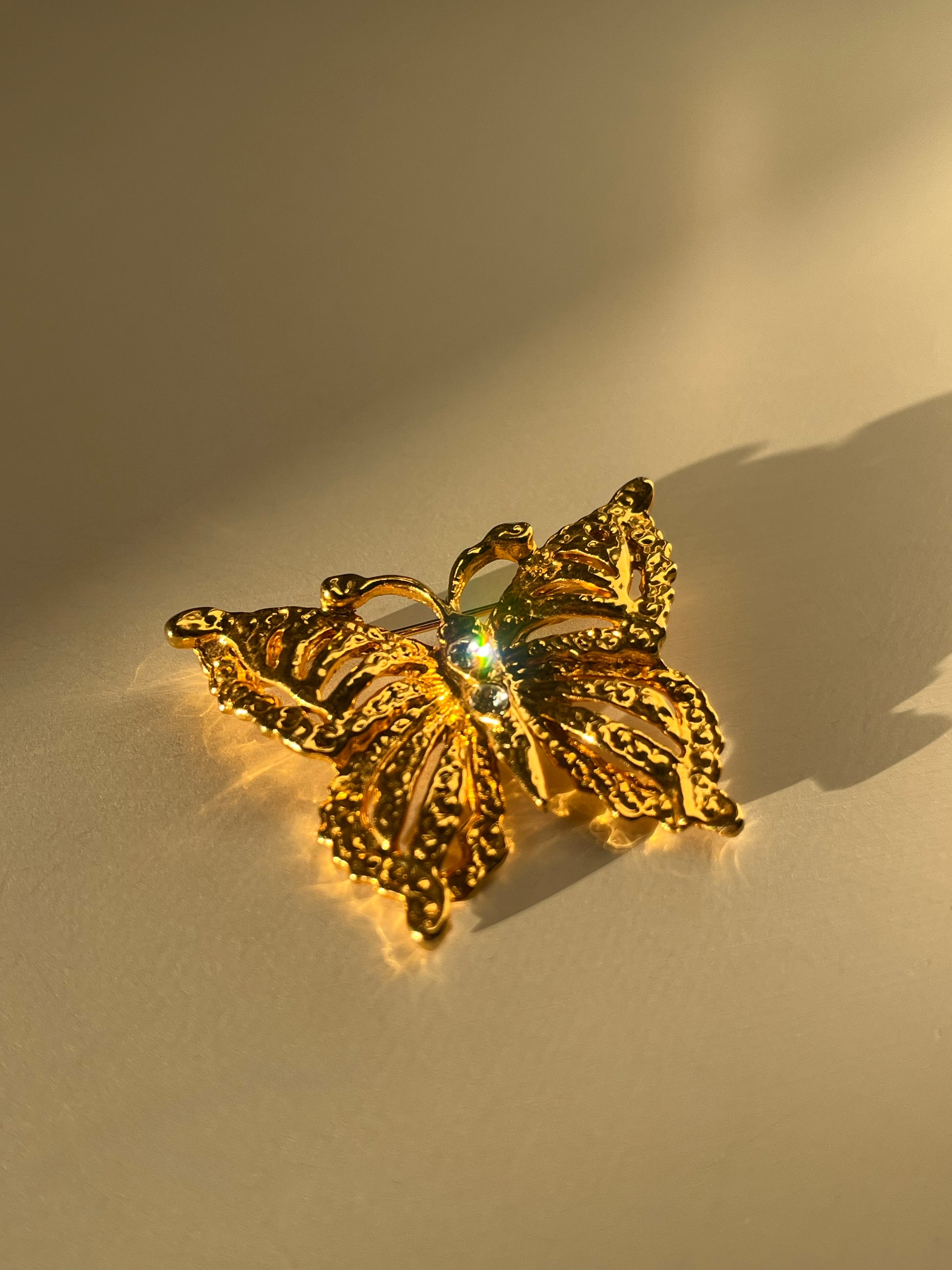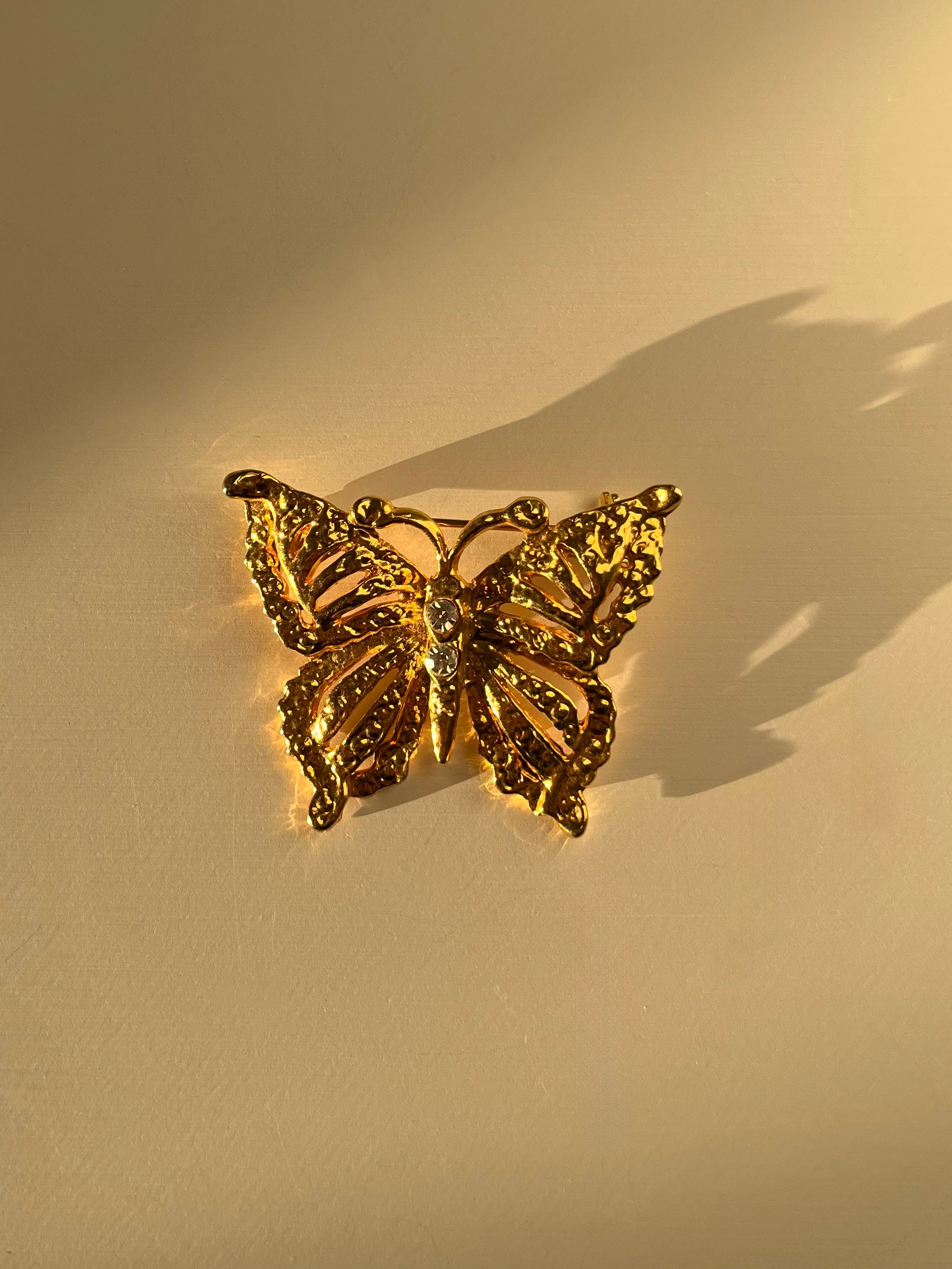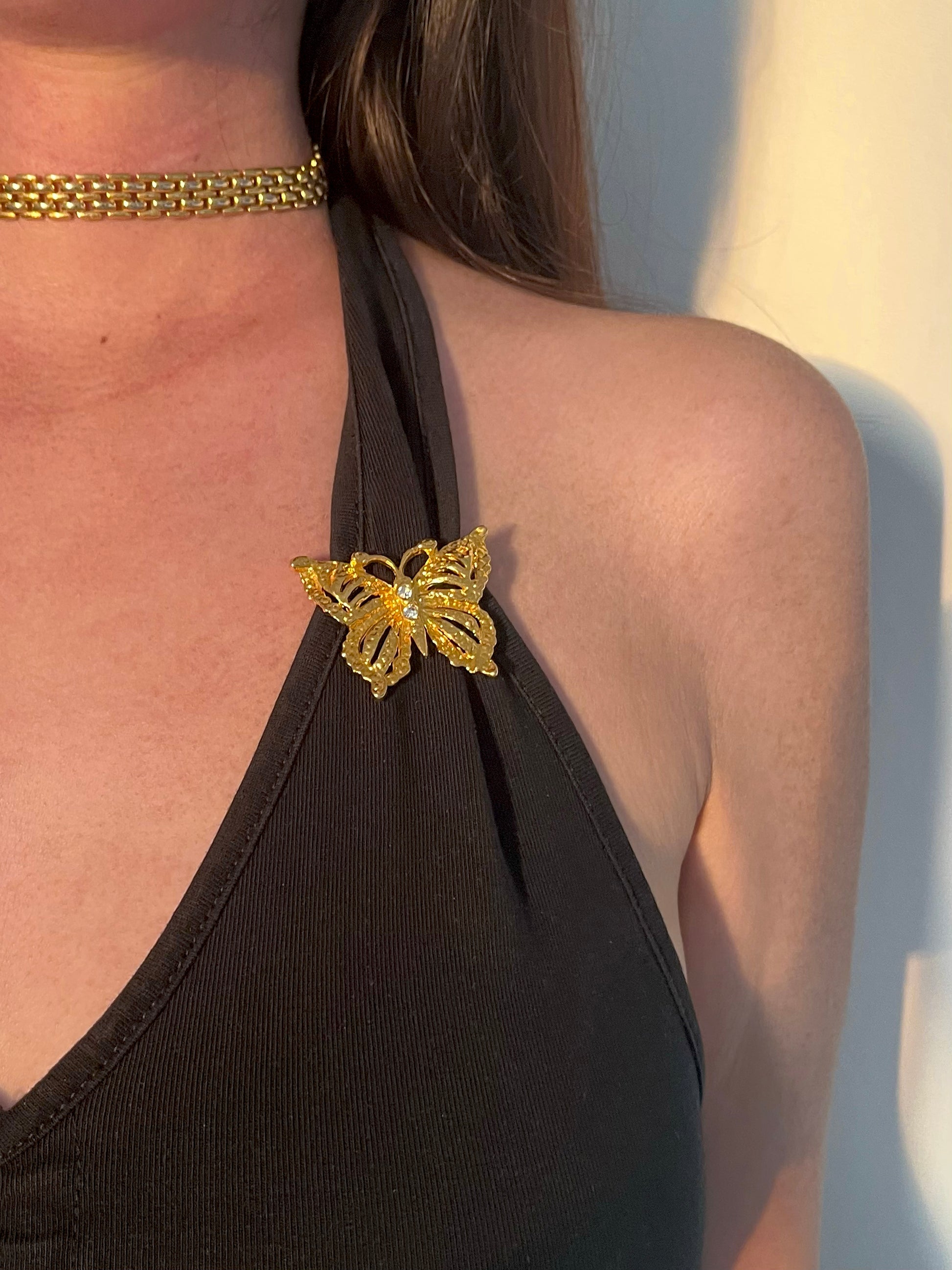 Cette broche papillon dorée, ornée de deux strass étincelants en son centre, allie délicatesse et éclat. Elle peut se porter sur un vêtement, une casquette, en choker ou encore sur un sac pour personnaliser les tenues selon les envies.