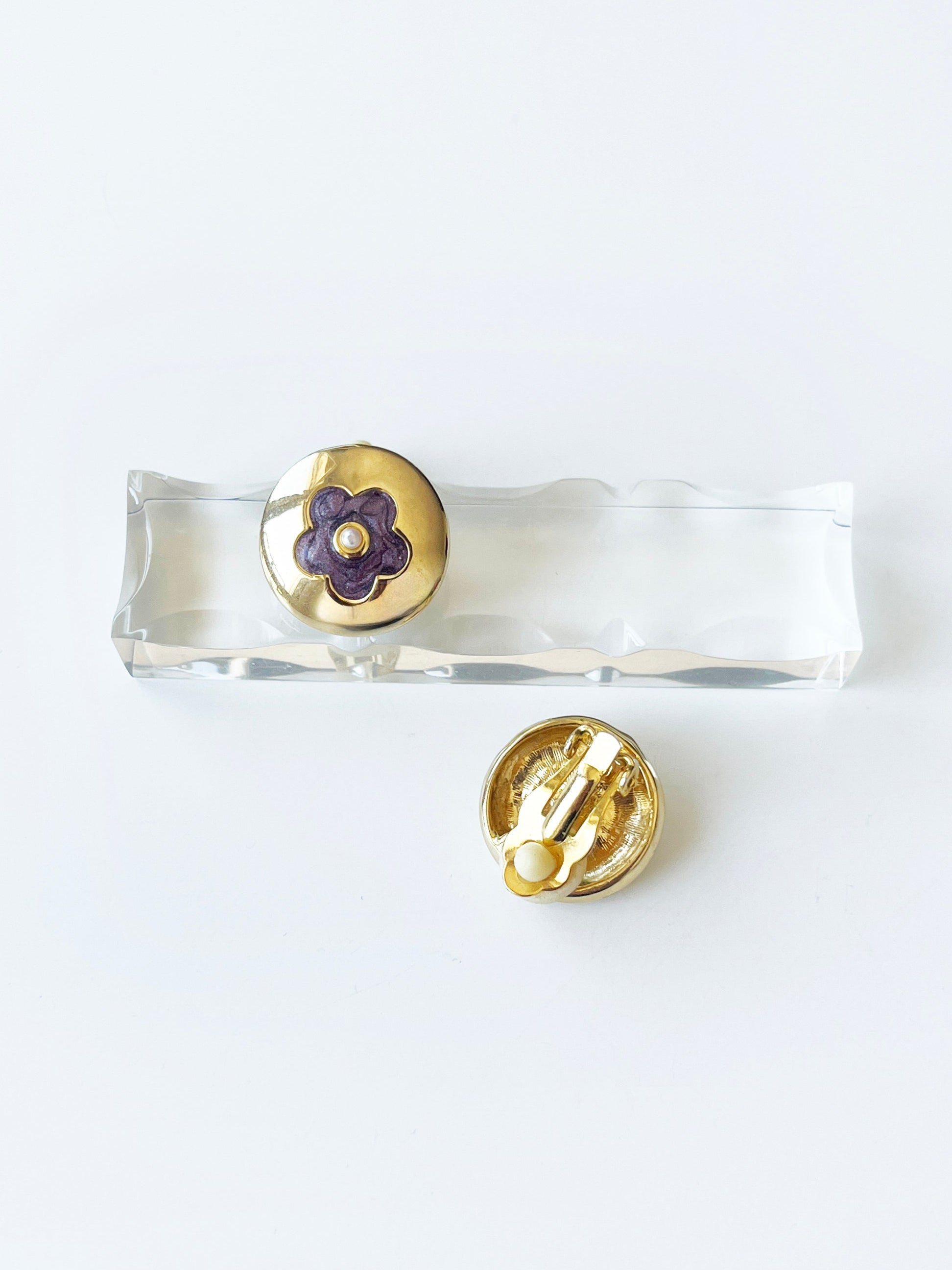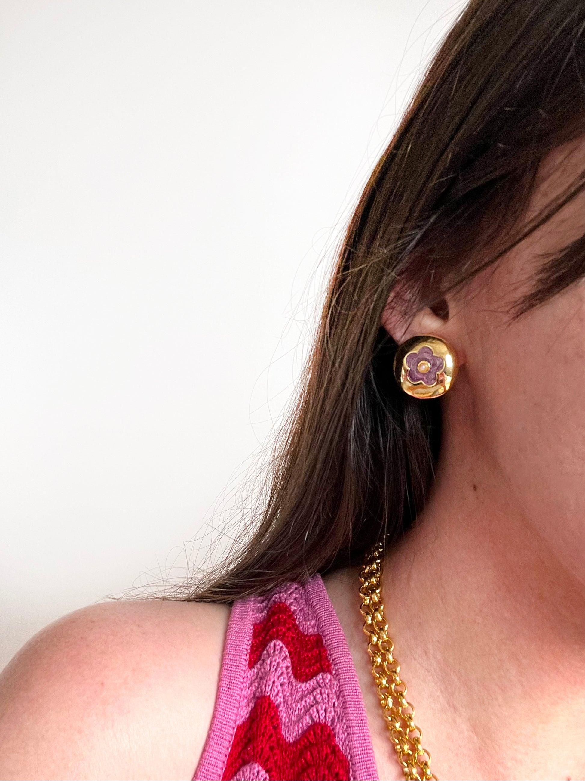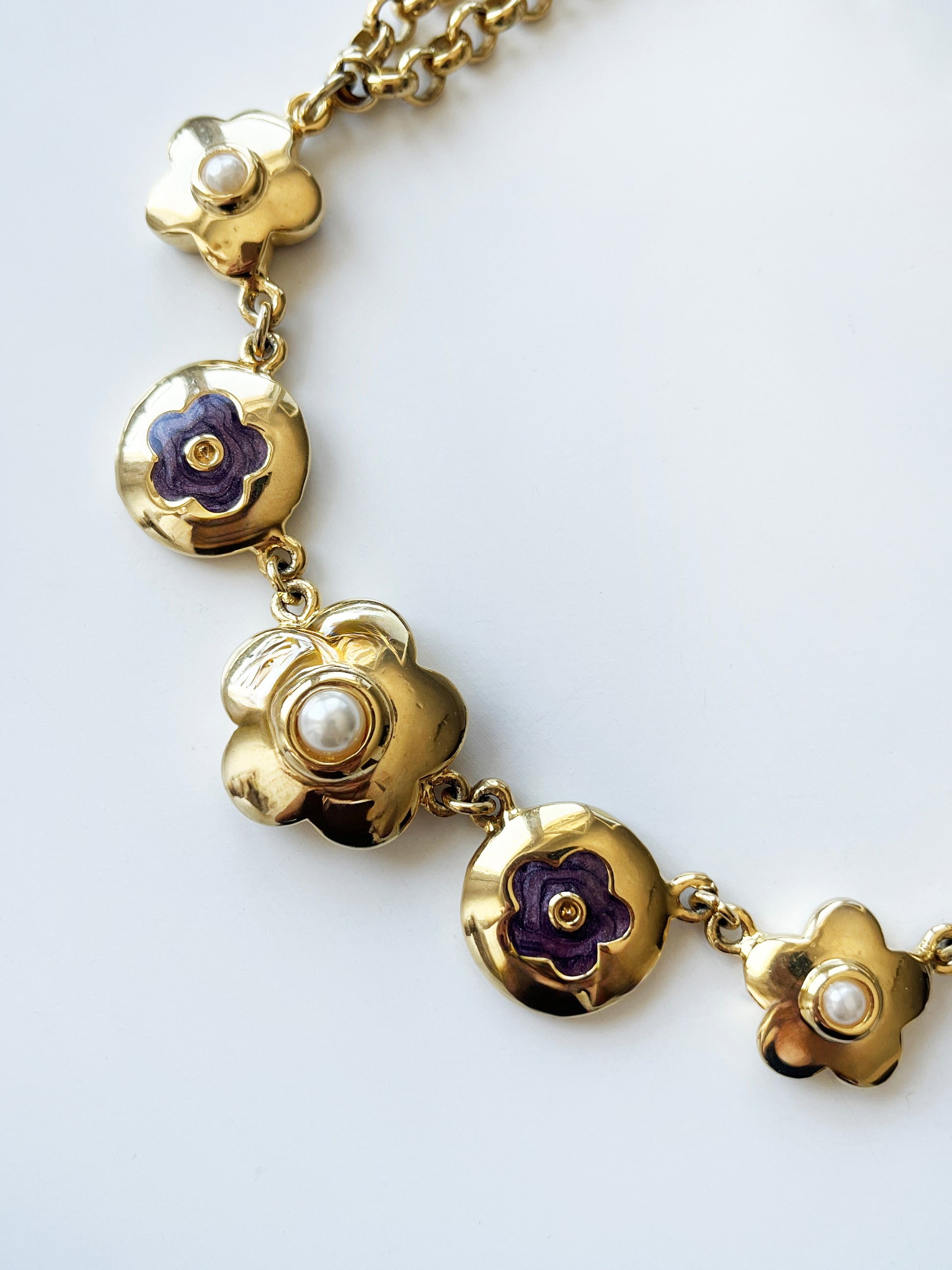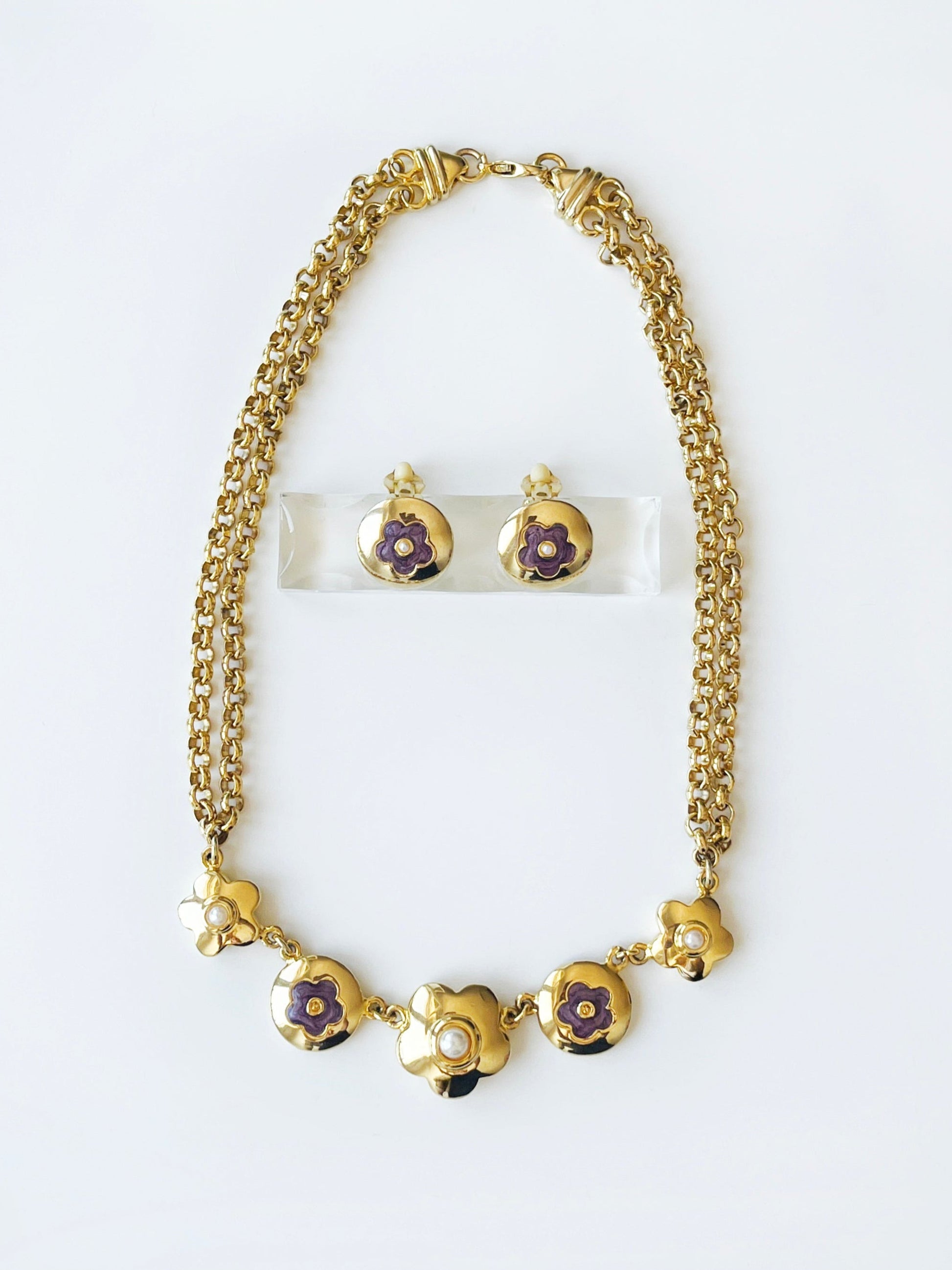 Cette parure dorée à fleurs en émail violet composée d'un collier et de clips d'oreilles est l'ensemble parfait pour ajouter une touche de charme et de féminité à votre tenue.