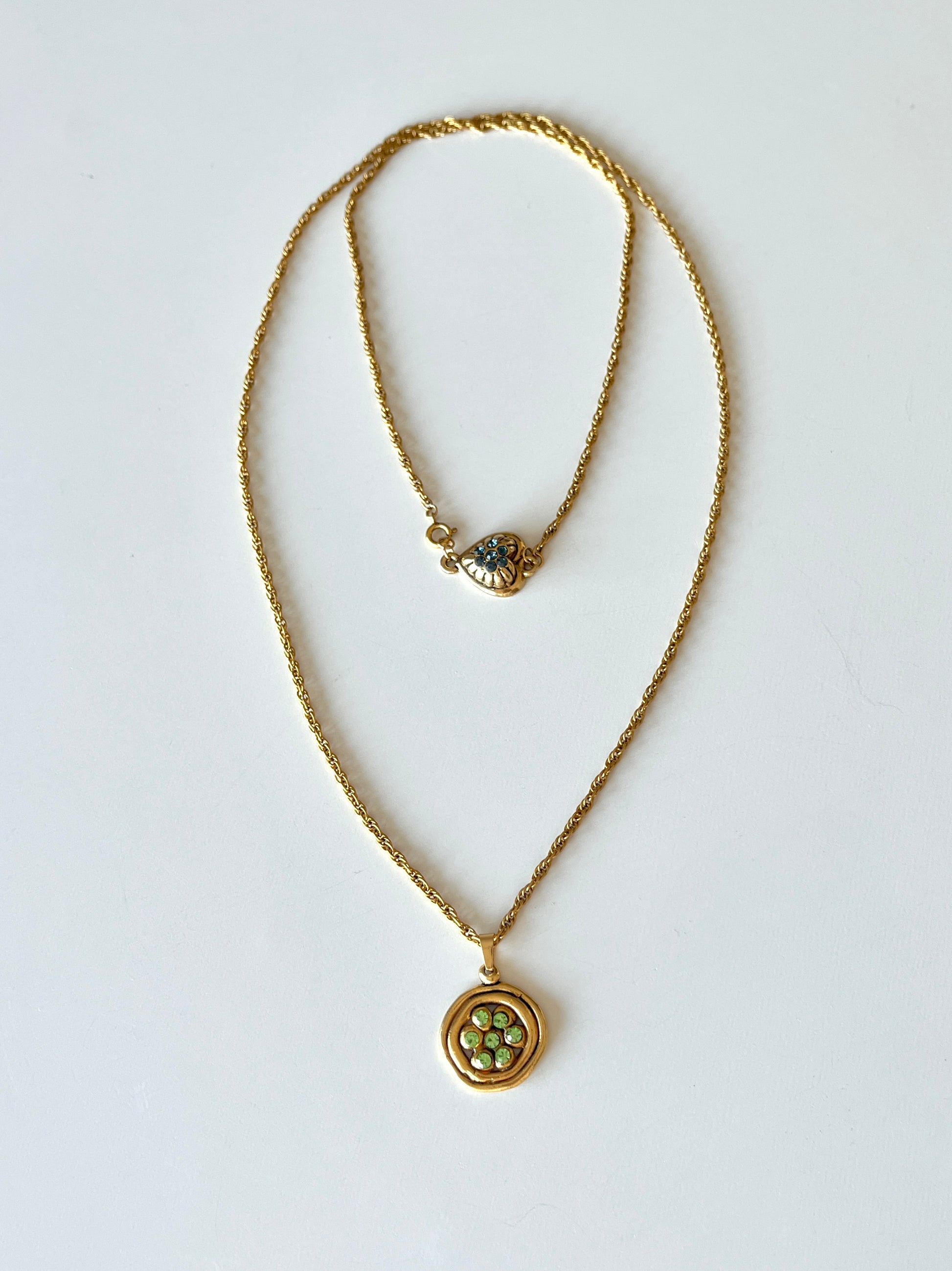Matériau: Chaine plaquée or, pendentifs métal doré, strass bleu et vert
